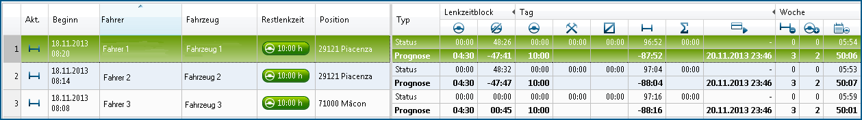 In der Spalte Lenkzeitblock: In der Zeile Status wird hier angezeigt, wie lange der Fahrer in diesem Lenkzeitblock bereits fährt, die Zeile Prognose zeigt die daraus resultierende, noch erlaubte Restlenkzeit in diesem Lenkzeitblock an. In der Zeile Status wird hier angezeigt, wie lange die Lenkzeit in diesem Lenkzeitblock unterbrochen wurde, die Zeile Prognose zeigt die daraus resultierende, noch erforderliche Lenkzeitunterbrechung an. In der Spalte Tag: In der Zeile Status wird hier angezeigt, wie lange der Fahrer an diesem Tag bereits gefahren ist, die Zeile Prognose zeigt die daraus resultierende, noch erlaubte Restlenkzeit an diesem Tag an. In der Zeile Status wird hier angezeigt, wie lange der digitale Tachograph des Fahrers an diesem Tag bereits auf den Status Arbeit eingestellt war. In der Zeile Status wird hier angezeigt, wie lange der digitale Tachograph des Fahrers an diesem Tag bereits auf den Status Bereitschaft eingestellt war. In der Zeile Status werden die Ruhezeiten des Fahrers an diesem Tag angezeigt, wenn diese für die Tagesruhezeit gültig sind. Die Zeile Prognose zeigt die daraus resultierende noch erforderliche Ruhezeit des Fahrers an diesem Tag an. In der Zeile Status wird hier die Summe der Arbeits- Bereitschafts- und Lenkzeit des Fahrers an diesem Tag angezeigt. In der Spalte Woche: In der Zeile Status wird hier die aktuelle Anzahl der Ruhezeitverkürzungen des Fahrers in dieser Woche angezeigt, die Zeile Prognose zeigt die daraus resultierende, noch erlaubte Anzahl an Ruhezeitverkürzungen in dieser Woche an. In der Zeile Status wird hier die aktuelle Anzahl der Lenkzeitverlängerungen (auf 10 Stunden) des Fahrers in dieser Woche angezeigt, die Zeile Prognose zeigt die daraus resultierende, noch erlaubte Anzahl an Lenkzeitverlängerungen in dieser Woche an. In der Zeile Status wird hier die aktuelle Summe der Lenkzeiten des Fahrers in dieser Kalenderwoche angezeigt, die Zeile Prognose zeigt die daraus resultierende, noch erlaubte Restlenkzeit in dieser Woche an. In der Zeile Status wird hier die aktuelle Summe der Lenkzeiten des Fahrers in der Doppelwoche (aktuelle Kalenderwoche plus letzte Kalenderwoche) angezeigt, die Zeile Prognose zeigt die daraus resultierende, noch erlaubte Restlenkzeit in der Doppelwoche an. Die Zeile Prognose zeigt die erlaubte Lenkzeit des Fahrers in der nächsten Kalenderwoche an. Die Summe aus der aktuellen Wochenlenkzeit des Fahrers und der Lenkzeit der nächsten Woche darf 90 Stunden nicht überschreiten. In der Spalte Wochenruhezeit: In der Zeile Status wird hier die Ruhezeit des Fahrers in dieser Woche angezeigt, wenn diese gerade läuft.Die Zeile Prognose zeigt an, wie lange die Ruhezeit des Fahrers noch dauern muss, wenn er sich aktuell in dieser befindet. Fleetboard berücksichtigt eventuelle Ausgleichszeiten, die aus Verkürzungen herrühren, nicht.