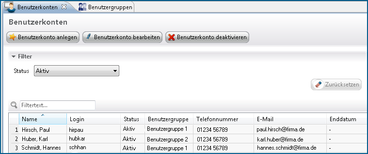 Standardmäßig werden in der Liste nur Benutzer angezeigt, deren Benutzerkonto derzeit aktiv ist. Um auch inaktive Benutzerkonten anzuzeigen, wählen Sie unter Status die Option Inaktiv oder die Option Alle aus.