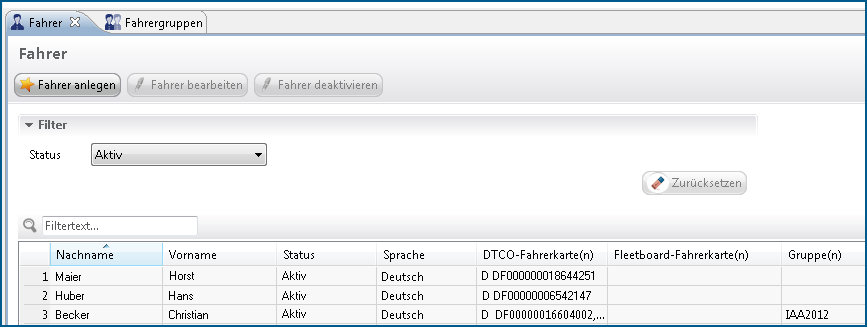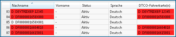 In der Spalte Nachname erscheint dann zunächst die vom digitalen Tachographen übertragene Fahrerkartennummer. In der Liste der Fahrer werden solche Einträge, denen noch kein Fahrername zugeordnet wurde, rot hinterlegt.