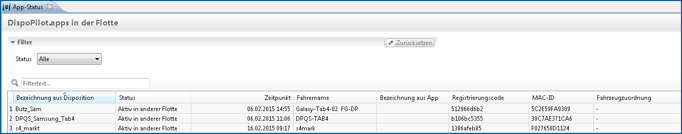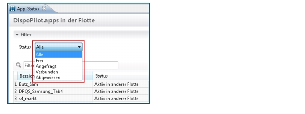 Der Status Frei bedeutet, dass die App keinem virtuellen Fahrzeug zugeordnet ist. Eine Verbindungsanfrage kann gestellt werden. Der Status Verbunden gibt an, dass die App mit einem virtuellen Fahrzeug Ihrer Flotte verbunden ist. Der Status Angefragt zeigt an, dass die Verbindungsanfrage mit der DispoPilot.app an den Fahrer verschickt, allerdings noch nicht bestätigt wurde. Der Status Abgewiesen zeigt an, dass die Verbindungsanfrage der DispoPilot.app mit dem virtuellen Fahrzeug vom Fahrer abgelehnt wurde und keinem virtuellen Fahrzeug zugeordnet ist. Eine Verbindungsanfrage kann gestellt werden. Unter dem Status Alle werden alle Apps angezeigt.