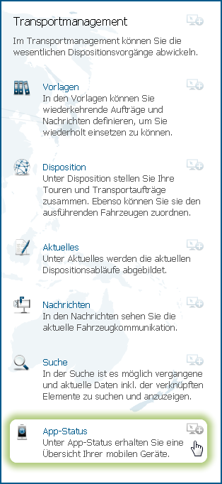 Den App-Status können Sie sowohl im Dienst Transportmanagement als auch im Dienst Messaging prüfen.Um den Bereich App-Status zu öffnen, klicken Sie in der Dienstauswahl z.B. im Bereich Transportmanagement auf die Schaltfläche App-Status.