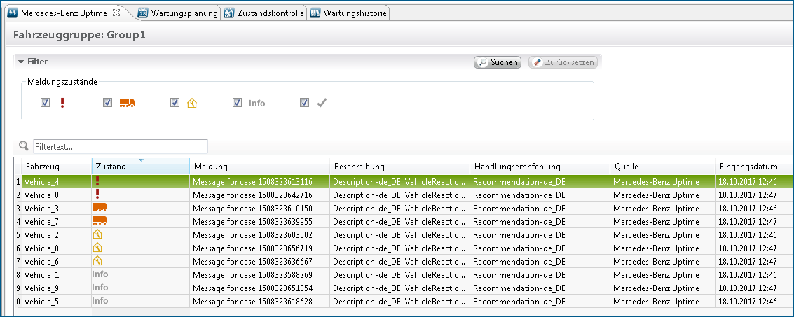 Diese Registerkarte wird nur dann angezeigt, wenn Sie den Dienst Mercedes-Benz Uptime gebucht haben.Mercedes-Benz Uptime ist für alle neuen Actros, Antos und Arocs Fahrzeuge ab Produktionsmonat 03/2017 in vielen EU Märkten erhältlich.