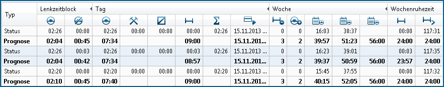 In der Tabellenzeile Prognose können Sie erkennen, wie viel Restlenkzeit der Fahrer in diesem Zeitabschnitt noch zur Verfügung hat.