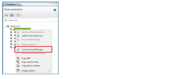 4. Right-click a vehicle in the Navigator or in the data table and select the Connect DispoPilot.app option.The Connect new DispoPilot.app to vehicle... dialogue box is opened.