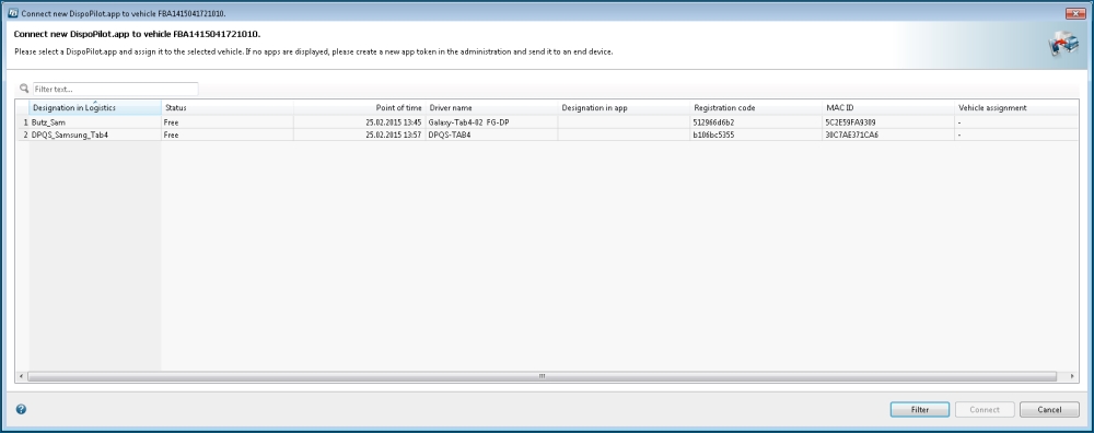 If the status Free is specified for the DispoPilot.app, you can connect the virtual vehicle with the app.The status Assigned, in contrast, shows that the app has already been connected with a virtual vehicle.The status Requested means that you have already sent a connection request and that this request has not yet been confirmed by the driver.The status Rejected means that the driver has rejected a request initiated by you and that the app is ready to receive further requests.The connection of the virtual vehicle with the DispoPilot.app is requested from the driver.