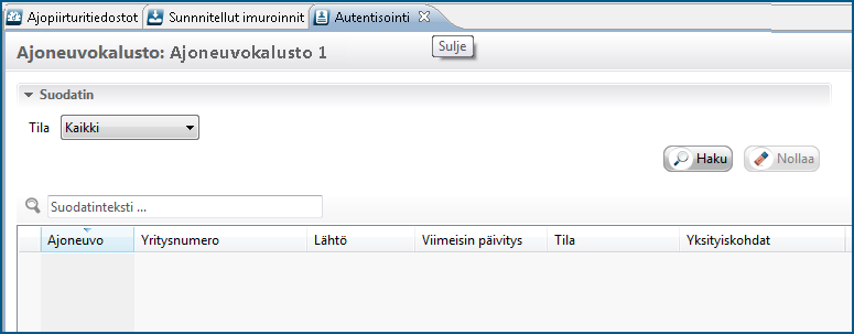 Välilehdeltä Autentisointi voi tarkastaa sillä hetkellä voimassa olevat autentisoinnit. Näyttöön tulevat silloin ajoneuvo, siihen kuuluva yritysnumero, autentisoinnin alku, viimeisimmän päivityksen ajankohta sekä tilasarake.